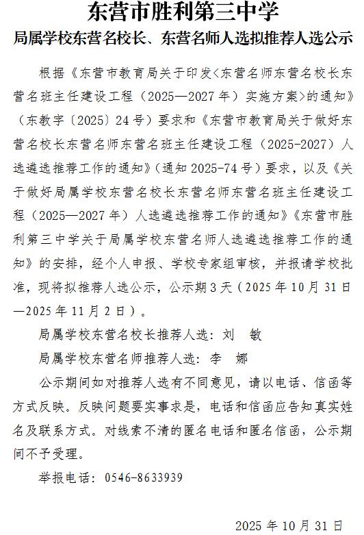 局属学校东营名校长、东营名师人选拟推荐人选公示