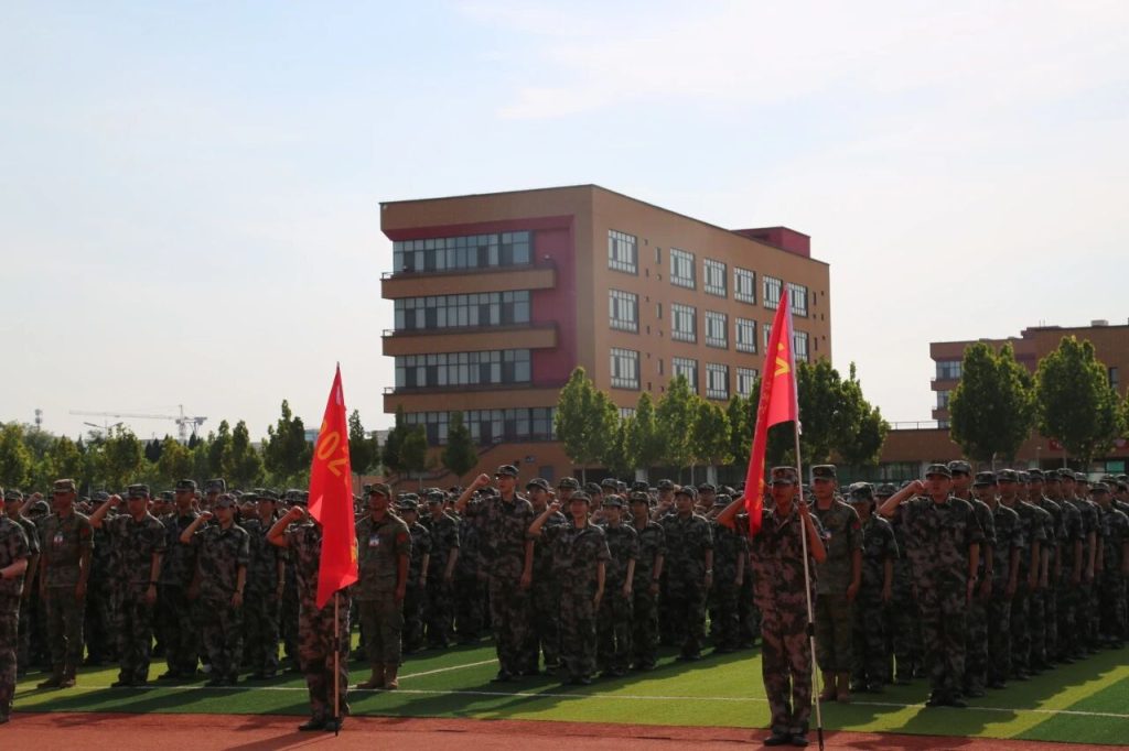 仪式伊始,全体人员面向国旗,奏唱中华人民共和国国歌,庄重的旋律中,爱国情怀在师生心中升腾。朱校长向军训营营长授营旗,鲜艳的营旗传递着使命与责任,拉开了军训帷幕。随后教官代表王俊凯发言,承诺将以专业素养和严格要求,助力学生锤炼意志、养成良好作风;学生代表张宇澳表态并领誓,展现出新生们积极参训、挑战自我的决心。