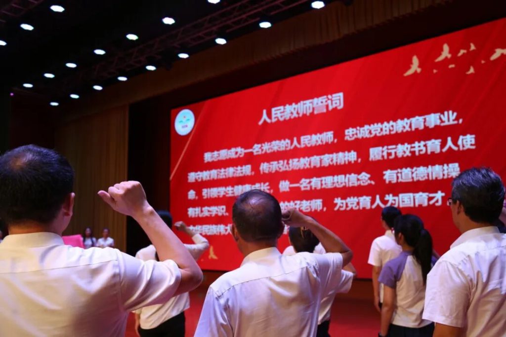 最后,全体新入职教师上台,与全体教师一同庄严宣誓,做出庄严承诺,共同表达我们不忘初心、牢记使命的信念和全力以赴投身教育事业的决心。